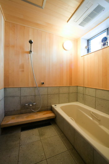 和風仕立ての浴室。木の香り、石の香り、共に自然の香りが心地よい。
