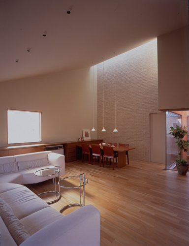 天井の変化が空間に動きを与えている。トップライトと共に右手の光庭からの光も効果的である。
