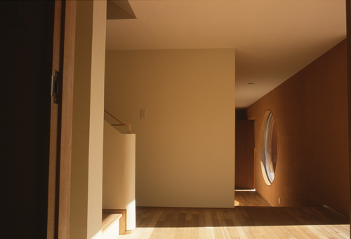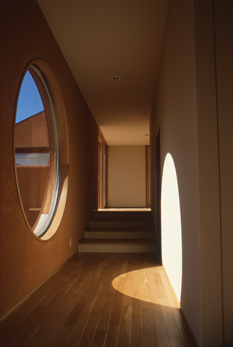 玄関からプライベートスペースへ。光がさしこむ丸窓。