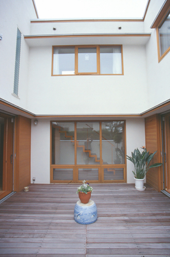 中庭をつくることが最大の要求であり、又同時にテーマだった。近隣の関係で、南向きの中庭が取れなかった為居間部分を平屋として高さをおさえ、なるべく長い時間中庭に日がおちる様に考えた。