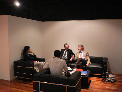 打ち合わせスペースで『Casa BRUTUS』の取材を受ける社長のワイル氏とファツィオリ氏(右)