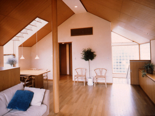 逆転プラン。2階のリヴィング・ダイニングを見る。右手のガラスブロックの部分が階段。左手がダイニングスペース。 |