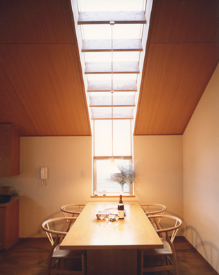 ダイニングテーブルの上にとったトップライト。北側に面するように設置し、さらにルーバーにより光を調整している。優しい光がテーブルにふりそそぐ。