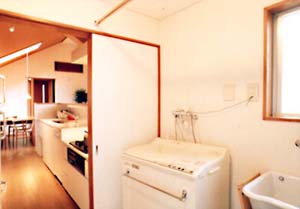 逆転プランの欠点のひとつである主婦の労働量の低減の為、作業の道線を短くする工夫が必要である。ここでは台所の横が洗濯室となっている。この部屋から外階段・サービスバルコニーに出られる。 |