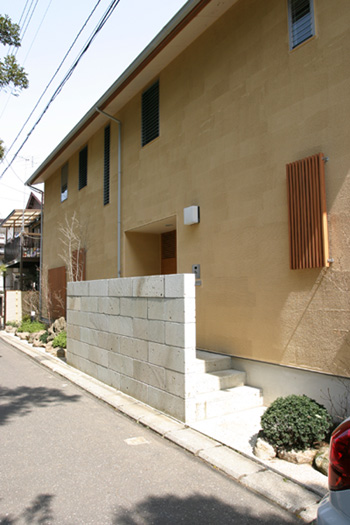 道路に面した壁。この家で唯一平らな壁が続く面でもある。