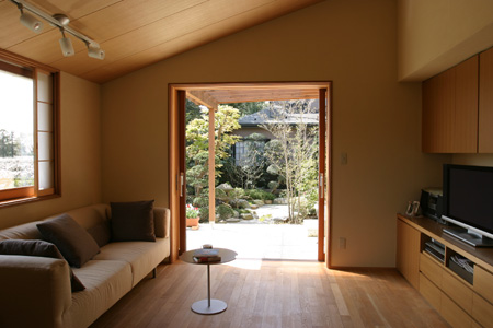 置物を飾る棚や、本棚など収納を考えた家である。 全体に開口部を大きくとり、圧迫感の無い開放的な作りとなった。