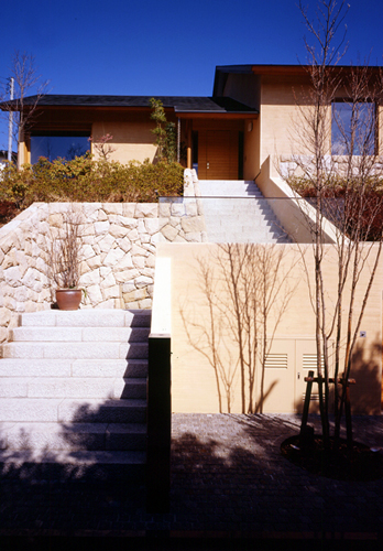 道路から玄関へ至るアプローチを見る。階段は御影石のムク材。