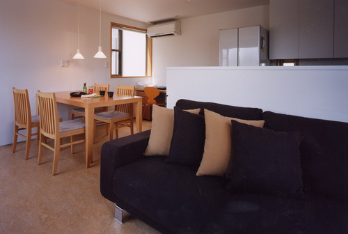 | LDK。床、壁、家具の色合いが品良くまとまっています。お互いに仕事を持たれているご夫婦が、この部屋の中で食事、団欒が完結できるように配慮しています。 |