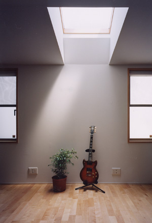 寝室の窓、大きなトップライトからは柔らかい日の光が差し込みます。
