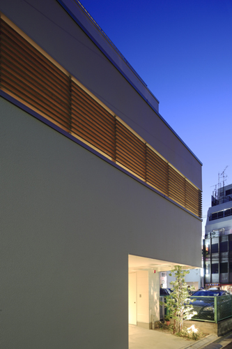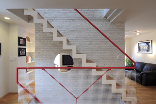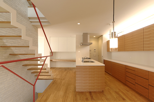 南側は大きな幹線道路に面しており、北側には中層マンションに接する典型的な都市型住宅。その為、採光と通風は、階段上のトップライトと、北側に作った高い目隠し塀のある大きなバルコニーから得ることとして、南側は閉鎖的なデザインとなっている。