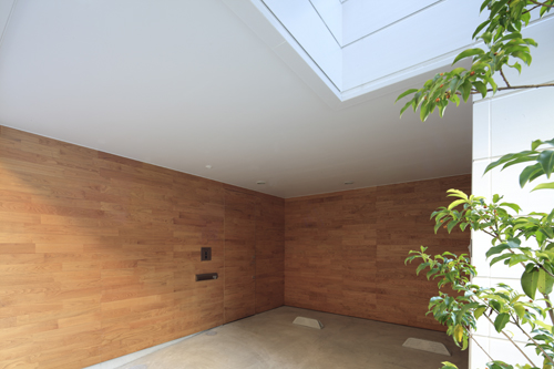 玄関ポーチ兼車庫を見る。 壁と扉は栗材を使用。 |