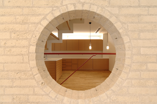 壁にあけられた丸い穴が 目線のやり取りを可能とし、空間をつなげている。 |