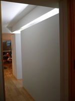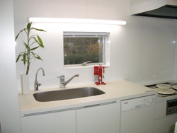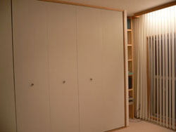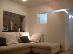 | 限られたスペースの中で、各部屋の用途に合わせた収納をできるだけ多く取るように工夫している。壁面全体を収納スペースとすることで大容量の収納が実現した。また、壁面を多く取ることで、白い壁に絵などをかけられる様に遊びの部分を各所に設けている。また、壁面の上部に開口などを設け、間接照明などを取ることにより、圧迫感のない間取りとなった。 |